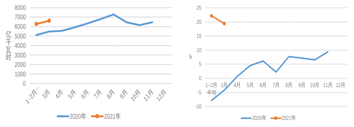 1-3月,全國全社會用電量19219億千瓦時,同比增長21.2%,其中,3月份全國全社會用電量6631億千瓦時,同比增長19.4%。