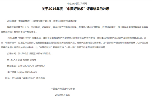 “中國(guó)好技術(shù)”是為深入貫徹落實(shí)黨中央、國(guó)務(wù)院關(guān)于實(shí)施創(chuàng)新驅(qū)動(dòng)發(fā)展戰(zhàn)略和“大眾創(chuàng)業(yè)、萬(wàn)眾創(chuàng)新”的精神,不斷激發(fā)全社會(huì)的創(chuàng)新創(chuàng)業(yè)活力,營(yíng)造全民創(chuàng)新的良好氛圍,由中國(guó)生產(chǎn)力促進(jìn)中心協(xié)會(huì)同國(guó)家相關(guān)機(jī)構(gòu)和企業(yè)共同發(fā)起和舉辦的,此獎(jiǎng)項(xiàng)評(píng)選為每年一次。在2016年度“中國(guó)好技術(shù)”征集中,得到了全國(guó)各級(jí)生產(chǎn)力促進(jìn)中心和相關(guān)企業(yè)的大力支持,共征集科技創(chuàng)新產(chǎn)品和可產(chǎn)業(yè)化技術(shù)成果286項(xiàng),獲得“中國(guó)好技術(shù)”稱號(hào)有108個(gè)項(xiàng)目。評(píng)審“中國(guó)好技術(shù)”這項(xiàng)工作的目的,就是要把蘊(yùn)藏在民間的好技術(shù)變成好產(chǎn)品,把好產(chǎn)品推向國(guó)內(nèi)外市場(chǎng),讓中國(guó)的好產(chǎn)品變成中國(guó)的好品牌,讓中國(guó)的好品牌產(chǎn)生巨大經(jīng)濟(jì)效益和社會(huì)影響。讓“中國(guó)好技術(shù)”服務(wù)和支持“一帶一路”引領(lǐng)下的世界經(jīng)濟(jì)發(fā)展新格局,讓“中國(guó)好技術(shù)”走出國(guó)門,走向世界。