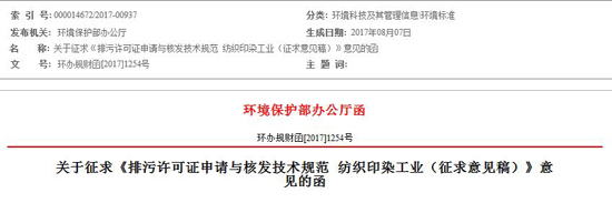關于征求《排污許可證申請與核發(fā)技術規(guī)范紡織印染工業(yè)(征求意見稿)》意見的函