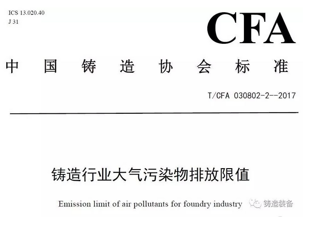 2017年7月31日,由中國鑄造協(xié)會(huì)發(fā)布的T/CFA030802-2—2017《鑄造行業(yè)大氣污染物排放限值》(中國鑄造協(xié)會(huì)標(biāo)準(zhǔn)公告 2017年 第06號)發(fā)布。該標(biāo)準(zhǔn)于2017年10月1日起實(shí)施。