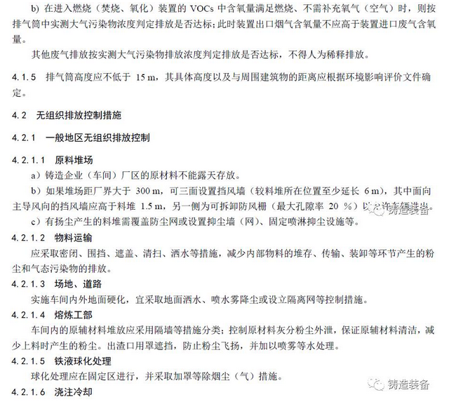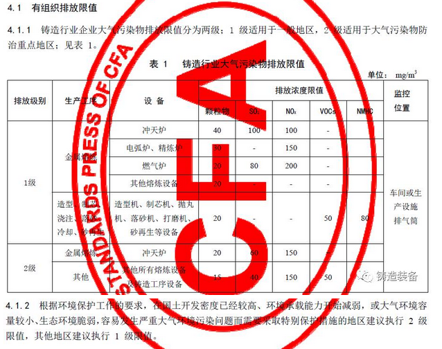 現(xiàn)摘錄T/CFA030802-2—2017中“4排放控制要求”、“5污染物監(jiān)測要求”、“6實(shí)施與監(jiān)督”部分。前三部分“1范圍、2規(guī)范性引用文件、3術(shù)語與定義”請自行登錄中國鑄造協(xié)會(huì)網(wǎng)站查閱。