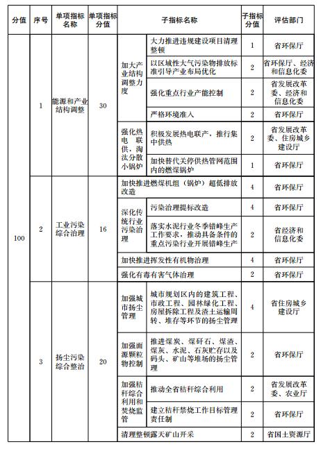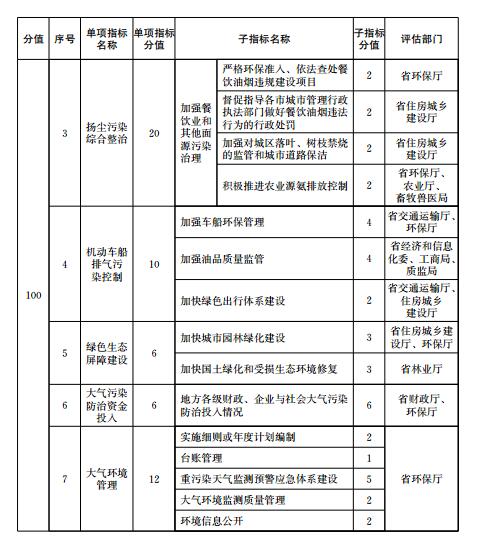 大氣污染防治重點(diǎn)任務(wù)完成情況包括能源和產(chǎn)業(yè)結(jié)構(gòu)調(diào)整、工業(yè)污染綜合治理、揚(yáng)塵污染綜合整治、機(jī)動(dòng)車船排氣污染控制、綠色生態(tài)屏障建設(shè)、大氣污染防治資金投入、大氣環(huán)境管理等7項(xiàng)指標(biāo)。大氣污染防治重點(diǎn)任務(wù)完成情況各指標(biāo)的定義、評(píng)估要求和計(jì)分方法等由有關(guān)評(píng)估部門按照《二期行動(dòng)計(jì)劃》的職責(zé)分工確定,評(píng)估部門根據(jù)子指標(biāo)分值對(duì)各市重點(diǎn)任務(wù)進(jìn)行打分,并向省環(huán)保廳提供評(píng)分結(jié)果。評(píng)估部門為兩個(gè)部門以上的,各評(píng)估部門分別打分后取平均值作為本項(xiàng)重點(diǎn)任務(wù)得分。