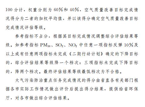 第四條評(píng)估采用評(píng)分法,空氣質(zhì)量改善目標(biāo)完成情況和大氣污染防治重點(diǎn)任務(wù)完成情況滿分均按滿分100分計(jì),綜合評(píng)估結(jié)果為二者的加權(quán)平均值,權(quán)重分別為60%和40%。評(píng)估結(jié)果分為優(yōu)秀、良好、合格、不合格四個(gè)等級(jí),其中,評(píng)分結(jié)果90分及以上為優(yōu)秀、70分(含)至90分為良好、60分(含)至70分為合格、60分以下為不合格。根據(jù)參考指標(biāo)目標(biāo)完成情況調(diào)整綜合評(píng)估結(jié)果等級(jí)作為最終評(píng)估結(jié)果。參考指標(biāo)PM10、SO2、NO2中任意一項(xiàng)指標(biāo)反彈10%及以上或有任意兩項(xiàng)指標(biāo)未完成《二期行動(dòng)計(jì)劃》確定的下降目標(biāo)的,綜合評(píng)估結(jié)果等級(jí)降一個(gè)檔次;三項(xiàng)指標(biāo)未完成下降目標(biāo)的,降兩個(gè)檔次。最終評(píng)估結(jié)果等級(jí)最低檔次為不合格。