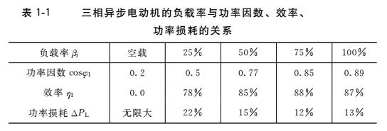 三相異步電動(dòng)機(jī)的負(fù)載率與功率因數(shù)、效率、功率損耗的關(guān)系見(jiàn)表1-1。