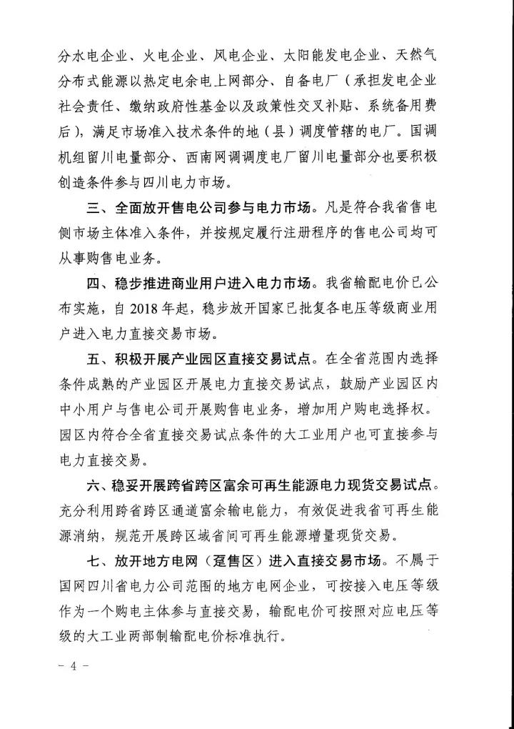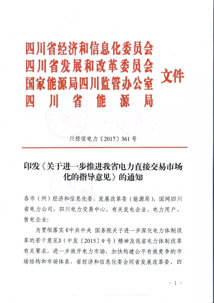 四川省經(jīng)信委、四川省發(fā) 改委、國(guó)家能源局四川監(jiān)管辦、四川省能源局日前聯(lián)合下發(fā)了《關(guān)于進(jìn)一步推進(jìn)我省電力直接交易市場(chǎng)化的指導(dǎo)意見》(以下簡(jiǎn)稱“意見”)。意見中稱,將規(guī)范完善直購(gòu)電的相關(guān)扶持政策,擴(kuò)大發(fā)電企業(yè)參與電力市場(chǎng)范圍,全面放開售電公司參與電力市場(chǎng),穩(wěn)步推進(jìn)進(jìn)商業(yè)用戶進(jìn)入電力市場(chǎng),積極開展產(chǎn)業(yè)園區(qū)直接交易試點(diǎn),穩(wěn)妥開展跨省跨區(qū)富余可再生能源電力現(xiàn)貨交易試點(diǎn),放開地方電網(wǎng)(躉售區(qū))進(jìn)入直接交易市場(chǎng),有序推進(jìn)其他特殊行業(yè)企業(yè)完全電力市場(chǎng)化。詳情如下: