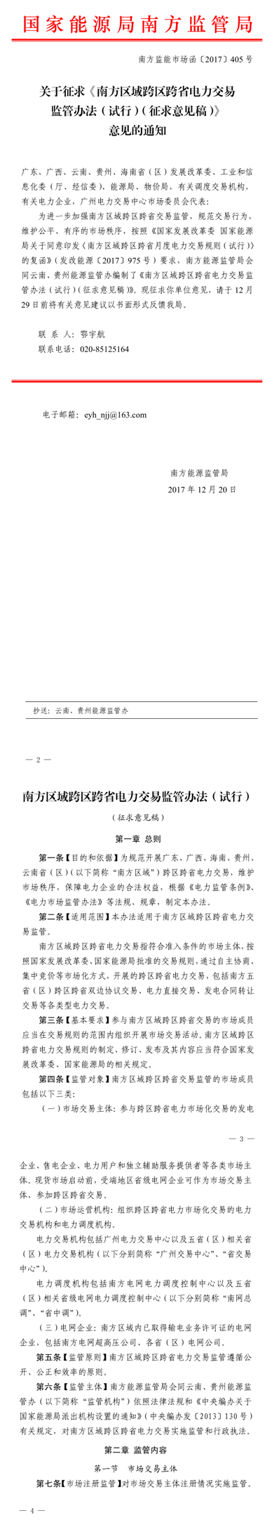 近日,國(guó)家能源局南方監(jiān)管局日前發(fā)布了《關(guān)于征求南方區(qū)域跨區(qū)跨省電力交易監(jiān)管辦法(試行)(征求意見稿)意見的通知》,辦法適用于南方區(qū)域(廣東、廣西、海南、云南、貴州)跨區(qū)跨省電力交易監(jiān)管。在征求意見期間,有意見可以反饋到國(guó)家能源局南方監(jiān)管局,截止日期為12月29日。