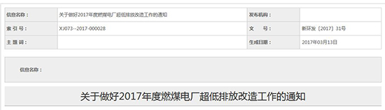 關(guān)于新疆維吾爾自治區(qū)2017年度燃煤電廠超低排放改造工作的通知