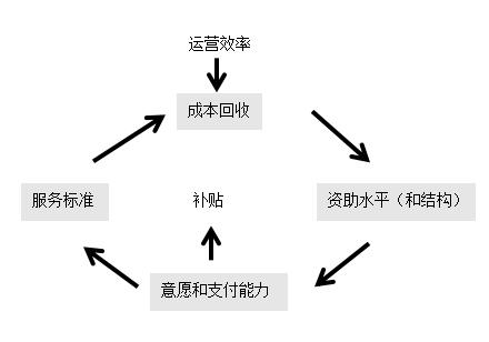 在PPP項目的資費設(shè)計中,需要平衡以下目標:(1)目標服務(wù)標準及相關(guān)成本;(2)公眾消費者的支付意愿及能力;(3)成本回收方式;(4)社會資本的經(jīng)濟要求(投資利潤率);(5)對政府補貼的需求及得到的可能性。各因素的正確組合可以通過項目模型的重復(fù)優(yōu)化來確定。資費設(shè)計循環(huán)過程如下圖所示:
