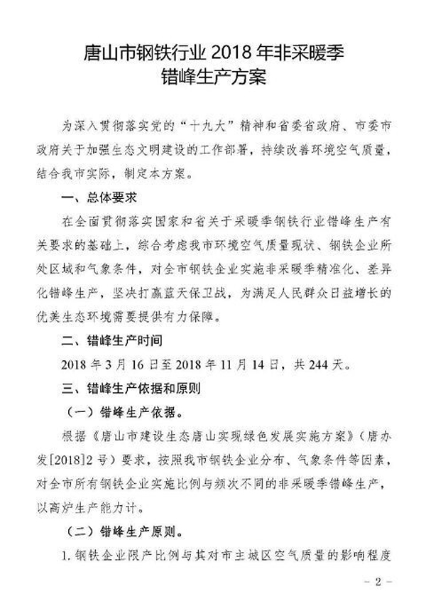 新聞中心日前,《唐山市鋼鐵行業(yè)2018年非采暖季錯峰生產(chǎn)方案》經(jīng)市政府同意,已正式下發(fā)。方案中明確了錯峰生產(chǎn)依據(jù)和原則,綜合考慮唐山市環(huán)境空氣質(zhì)量現(xiàn)狀、鋼鐵企業(yè)所處區(qū)域和氣象條件,對全市鋼鐵企業(yè)實施非采暖季精準(zhǔn)化、差異化錯峰生產(chǎn)。全文如下: