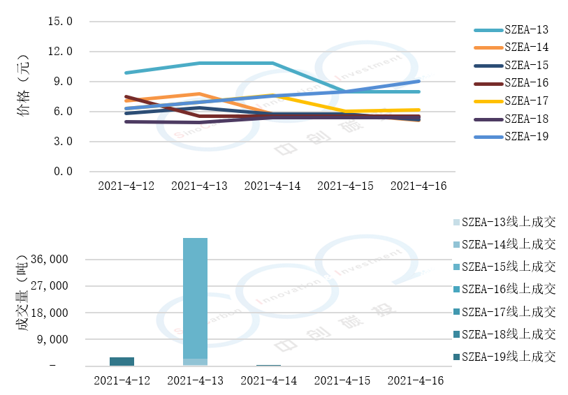 線(xiàn)上成交價(jià)最低為4.94(產(chǎn)品SZEA-18),最高為10.82元(產(chǎn)品SZEA-13),平均碳價(jià)為7.00元(平均碳價(jià)為各產(chǎn)品價(jià)格加權(quán)得出)。