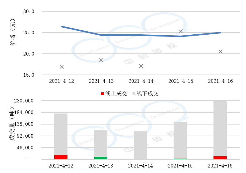 線(xiàn)上成交價(jià)最低為24.10元,最高為26.45元,平均碳價(jià)為24.87元。