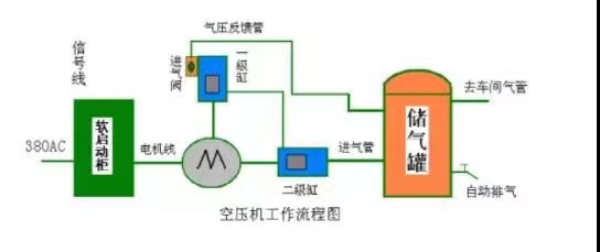 如空壓機(jī)工作流程圖所示:??? 螺桿壓縮機(jī)的工作原理可分為進(jìn)氣,壓縮和排氣三個過程。隨著轉(zhuǎn)子旋轉(zhuǎn),每對相互嚙合的齒相繼完成相同的工作循環(huán)。?