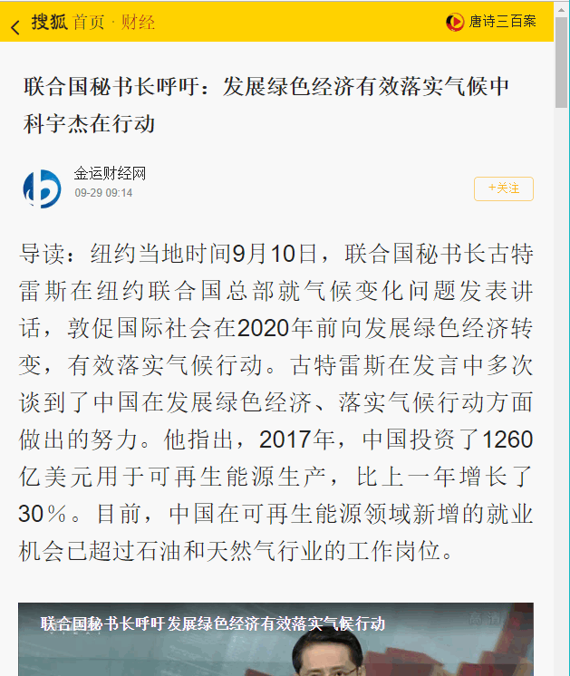導(dǎo)讀:紐約當(dāng)?shù)貢r(shí)間9月10日,聯(lián)合國(guó)秘書長(zhǎng)古特雷斯在紐約聯(lián)合國(guó)總部就氣候變化問題發(fā)表講話,敦促國(guó)際社會(huì)在2020年前向發(fā)展綠色經(jīng)濟(jì)轉(zhuǎn)變,有效落實(shí)氣候行動(dòng)。古特雷斯在發(fā)言中多次談到了中國(guó)在發(fā)展綠色經(jīng)濟(jì)、落實(shí)氣候行動(dòng)方面做出的努力。他指出,2017年,中國(guó)投資了1260億美元用于可再生能源生產(chǎn),比上一年增長(zhǎng)了30%。目前,中國(guó)在可再生能源領(lǐng)域新增的就業(yè)機(jī)會(huì)已超過石油和天然氣行業(yè)的工作崗位。