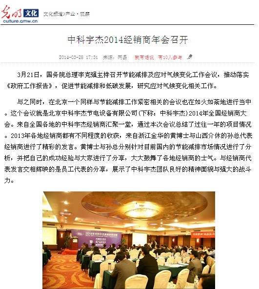 與之同時(shí),在北京一個(gè)同樣與節(jié)能減排工作緊密相關(guān)的會(huì)議也在如火如荼地進(jìn)行當(dāng)中。這個(gè)會(huì)議就是北京中科宇杰節(jié)電設(shè)備有限公司(下稱(chēng):中科宇 杰)2014年全國(guó)經(jīng)銷(xiāo)商大會(huì)。來(lái)自全國(guó)各地的中科宇杰經(jīng)銷(xiāo)商匯聚一堂,通過(guò)本次會(huì)議總結(jié)了過(guò)往一年的項(xiàng)目情況。2013年各地經(jīng)銷(xiāo)商都有不同程度的收 獲,來(lái)自浙江金華的黃博士與山西介休的孫總代表經(jīng)銷(xiāo)商進(jìn)行了精彩的發(fā)言。黃博士與孫總分別針對(duì)目前國(guó)內(nèi)的節(jié)能減排市場(chǎng)情況進(jìn)行了分析,并把自己的成功經(jīng)驗(yàn) 與大家進(jìn)行了分享,大大鼓舞了各地經(jīng)銷(xiāo)商的士氣。與經(jīng)銷(xiāo)商代表發(fā)言交相輝映的是員工代表的分享,展示了中科宇杰團(tuán)隊(duì)良好的精神面貌與強(qiáng)大的戰(zhàn)斗力。