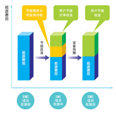 專業(yè)化的能源服務公司 (Energy Management Company 簡稱 EMC) 與愿意進行節(jié)能改造的客戶簽訂節(jié)能服務合同,按照合同采用先進的節(jié)能技術及全新的服務機制來為客戶實施節(jié)能項目。